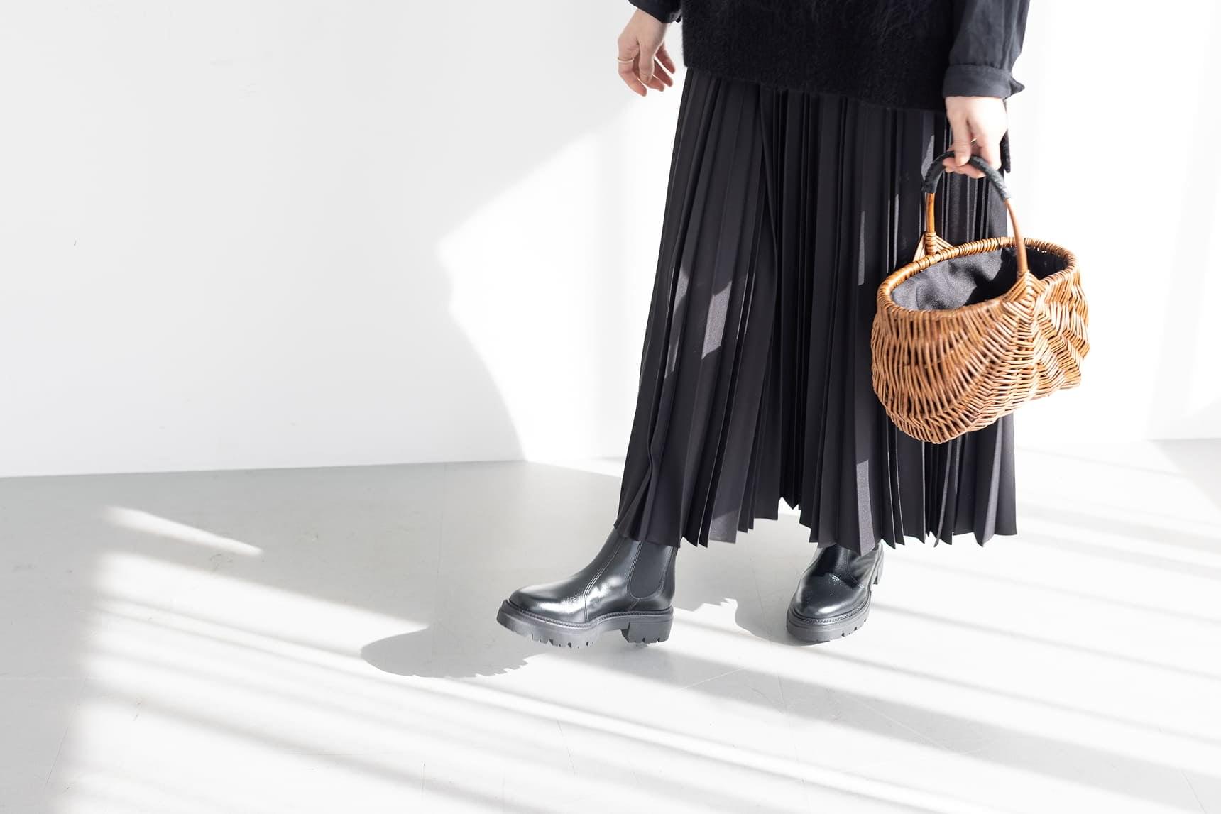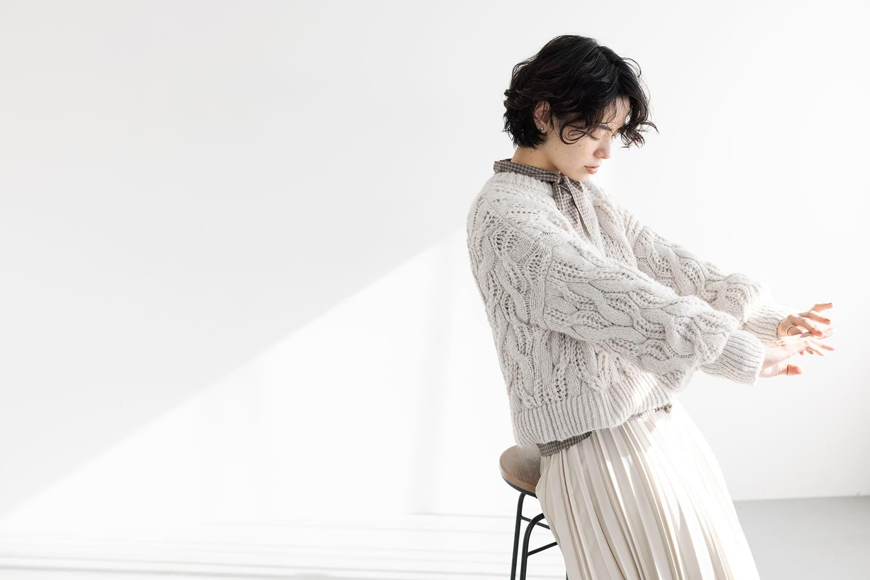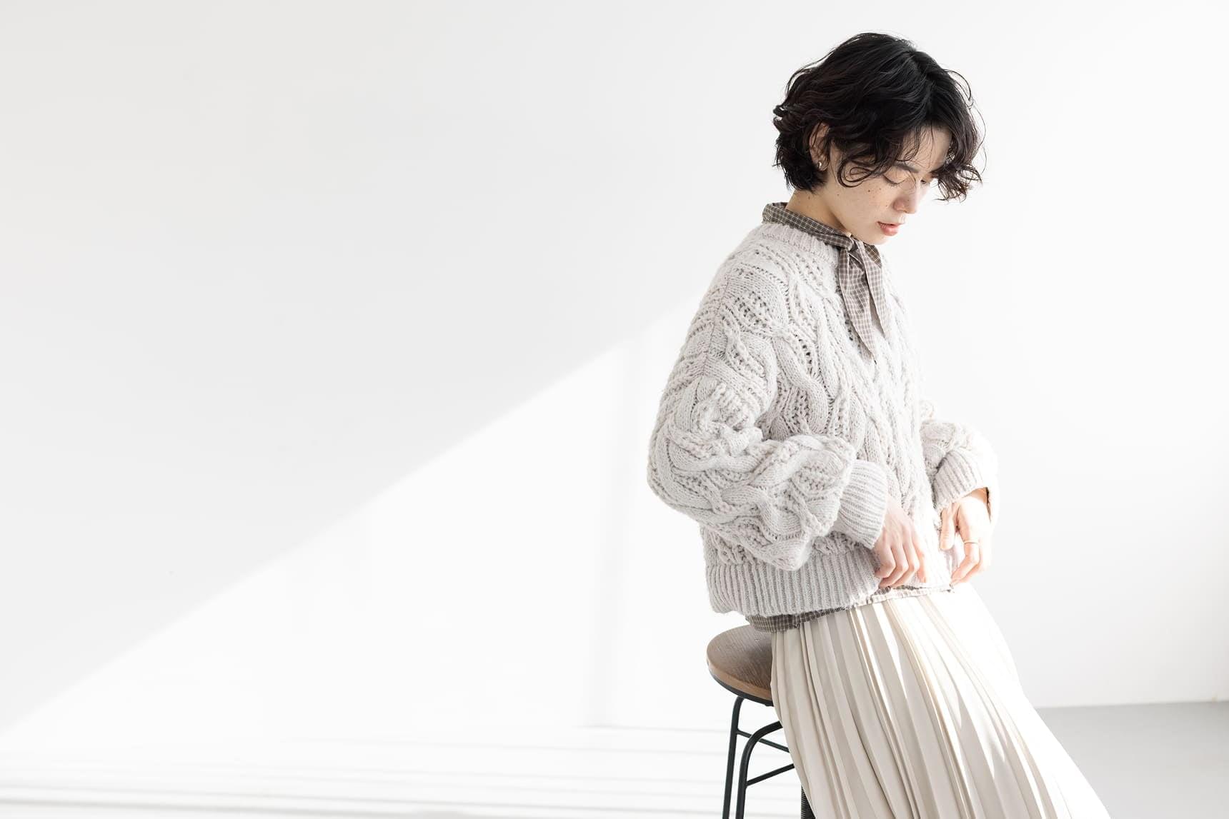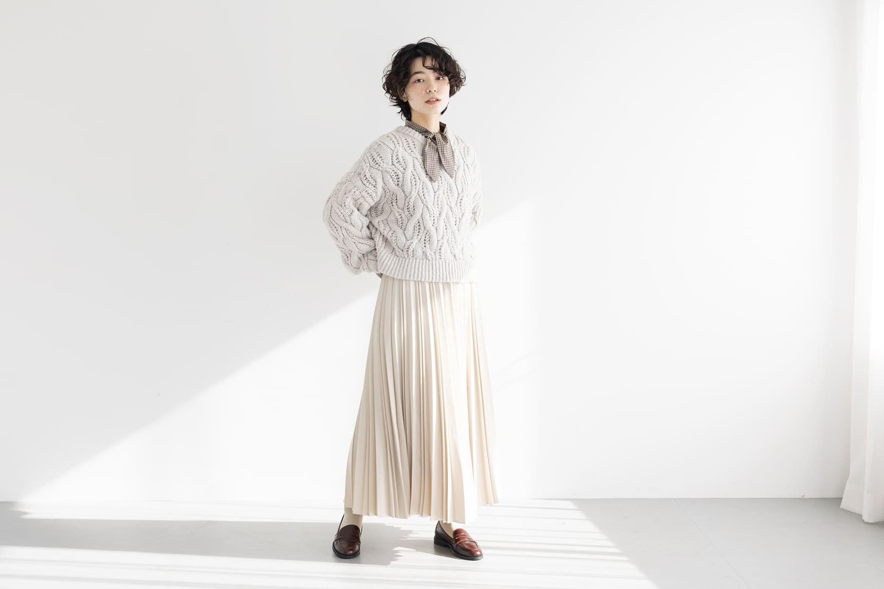 アラン編みのニットからチェックのボウタイシャツを覗かせ、プリーツスカートを合わせた表情豊かなスタイル。難しく感じがちな個性のあるアイテム同士の組み合わせも、色のトーンを揃え分量に変化をつけることで、バランスの取れたワンランク上の着こなしが完成します。
