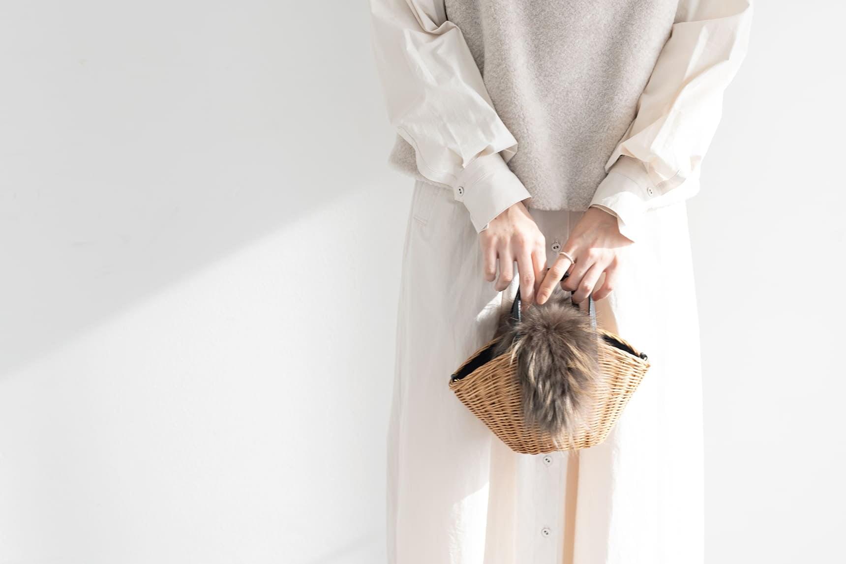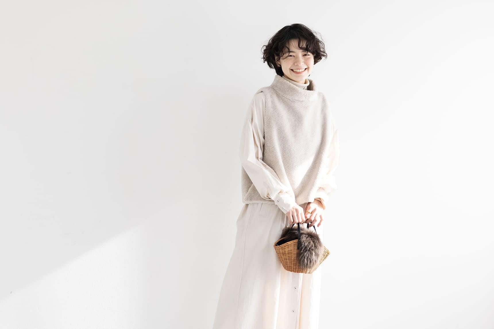フラットな質感のコットンシャツワンピースに、ふわふわのファーベストを重ねたやわらかな白のワントーンコーディネート。異なる素材感を組み合わせることで、単調になりがちなスタイルに心地よいリズムと奥行きが生まれます。かごバッグをやさしく効かせ、メリハリのある洗練された印象に。
