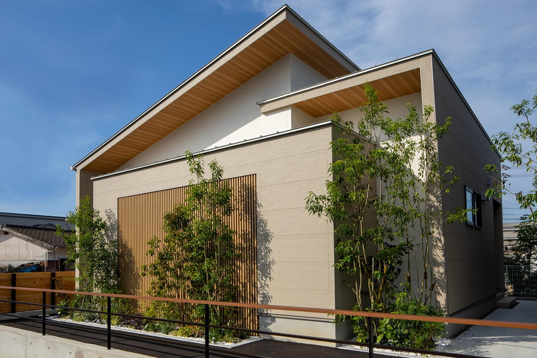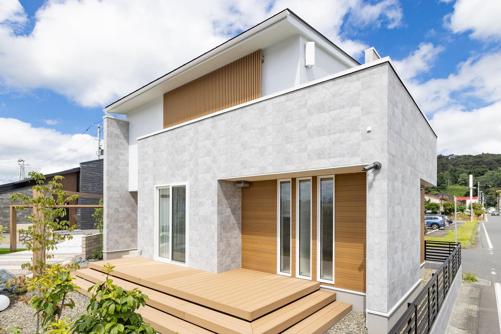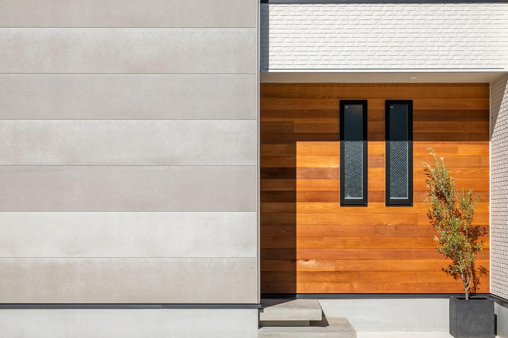 繊細なラインの外壁材「シュトラール18」をベースに、リアルな木目の「エーデルウッド」と大判の「ストーンタイル」をアクセントに採用。白の清潔感に、木の温もりと石のモダンさが加わって、ナチュラルでありながら洗練された印象に。異素材をバランスよく配置することで、視覚的なリズムと心地よい調和を生み出しています。