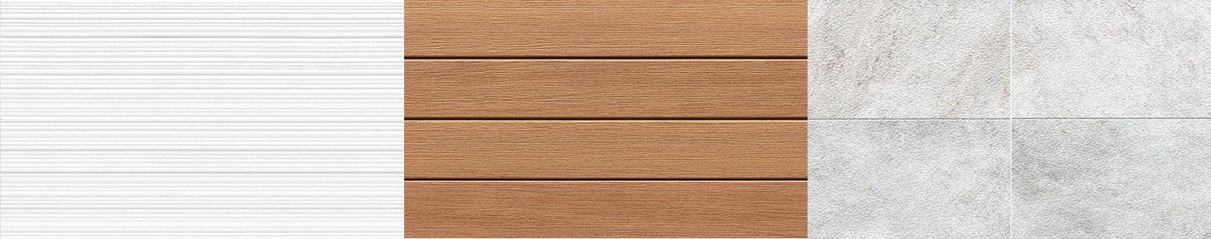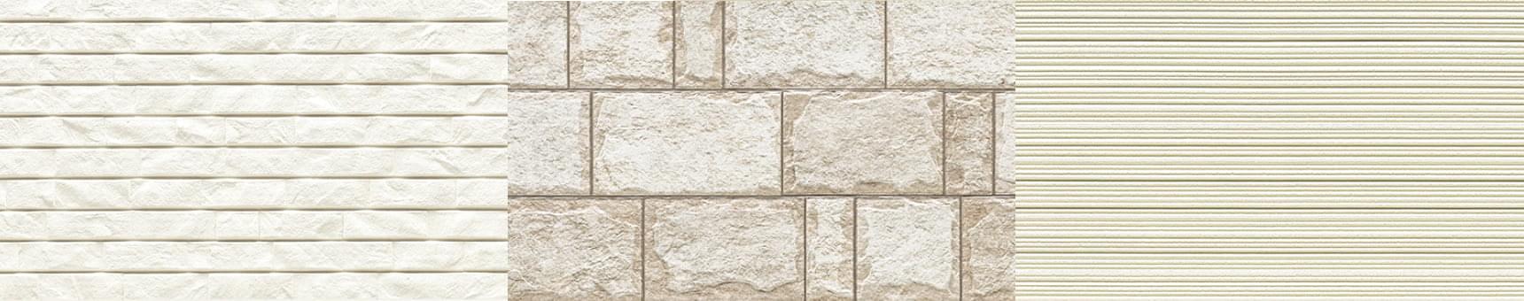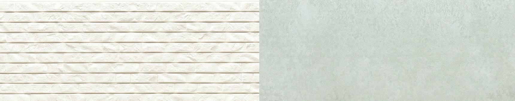 柔らかな曲線の外壁材「ラウンドウェーブ」に、ダイナミックな石積みの「ファサードストーン18」、そして直線のラインが美しい「シュトラール18」をレイヤード。同じ白でも、石の荒々しさや繊細なラインなど異なるテクスチャーを重ねることで立体感が生まれます。ニュアンスの違う白が響き合う素材感の違いを上手に生かしたコーディネートです。