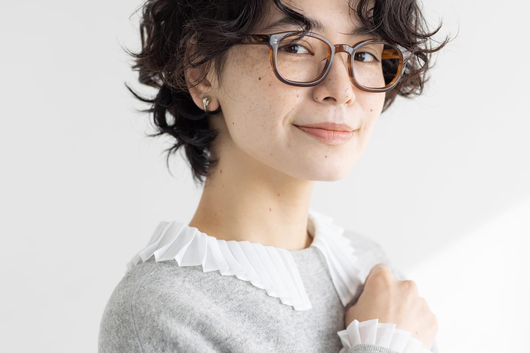 クールな霜降りグレーのスウェットから、エレガントなやさしい白のプリーツカラーを覗かせたリズミカルなテイストミックスのコーディネート。ブラウンのメガネで全体の温度を和らげることでクールさとやわらかさがバランスよく整い、洗練された心地よいスタイルに。