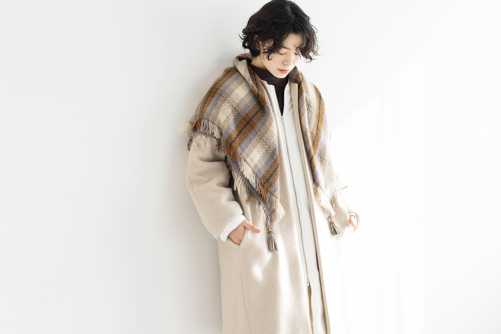 フラットなコットン、表情のあるニット、クールなナイロン、ウォーミーなウール、異なる素材を合わせた寒い季節の上品なレイヤードスタイルです。ホワイトからベージュへの優しい流れのグラデーションが、重たくなりがちな装いを軽やかでやさしい印象にまとめてくれます。