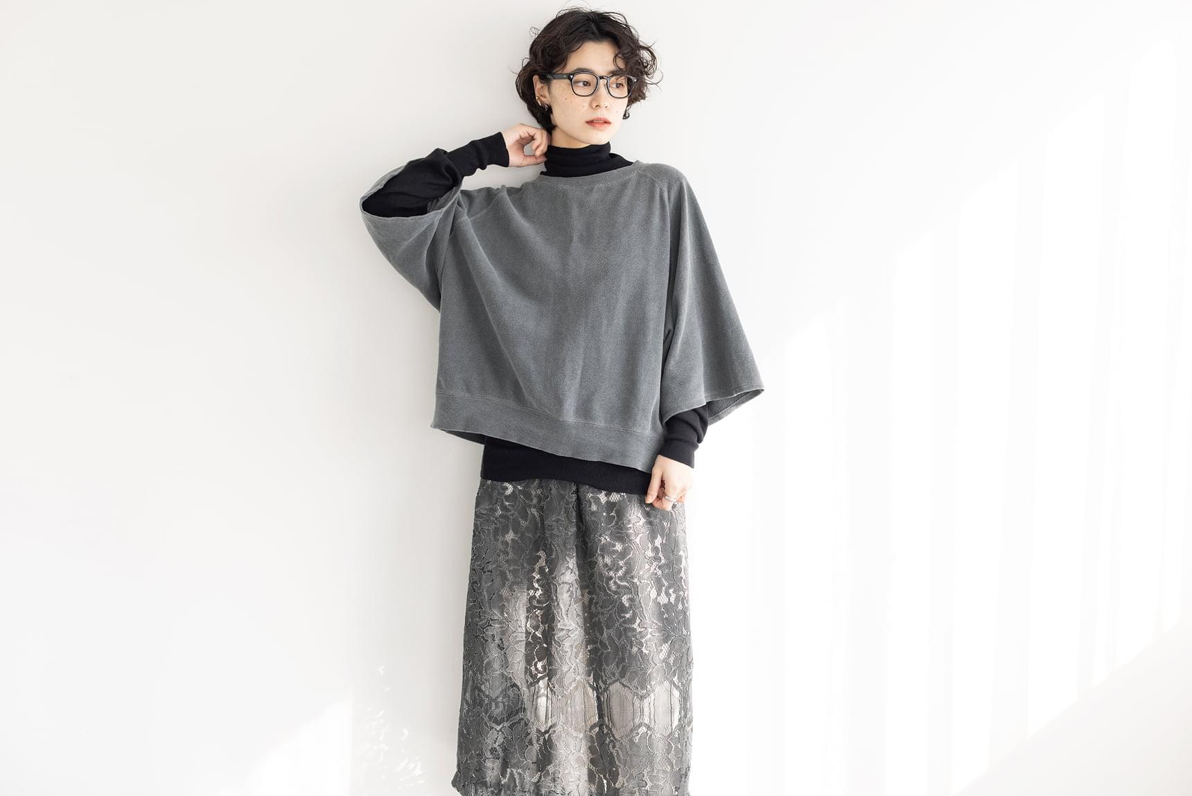 グレーを主役にしたモノトーンスタイル。ポイントは、カジュアルさをほどよく整えてくれるシックなレースのオーバースカート。可憐な透け感が加わることで、フラットになりがちなグレーの着こなしにメリハリと奥行きが生まれます。存在感のあるセルフレームのメガネとトラックソールのローファーでさらりとエッジを効かせ、今の気分に合う旬なスタイルに。