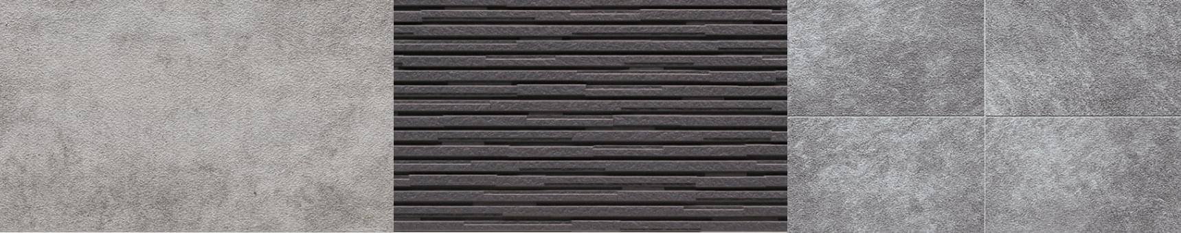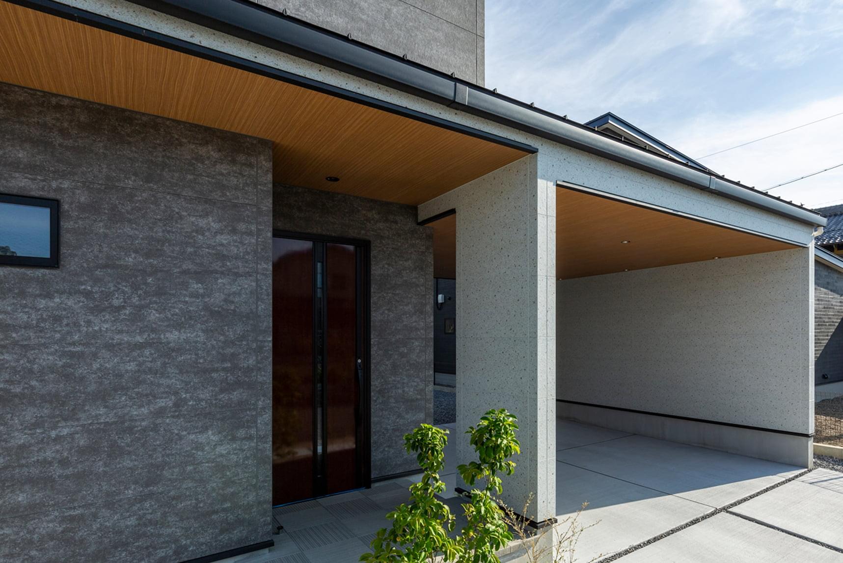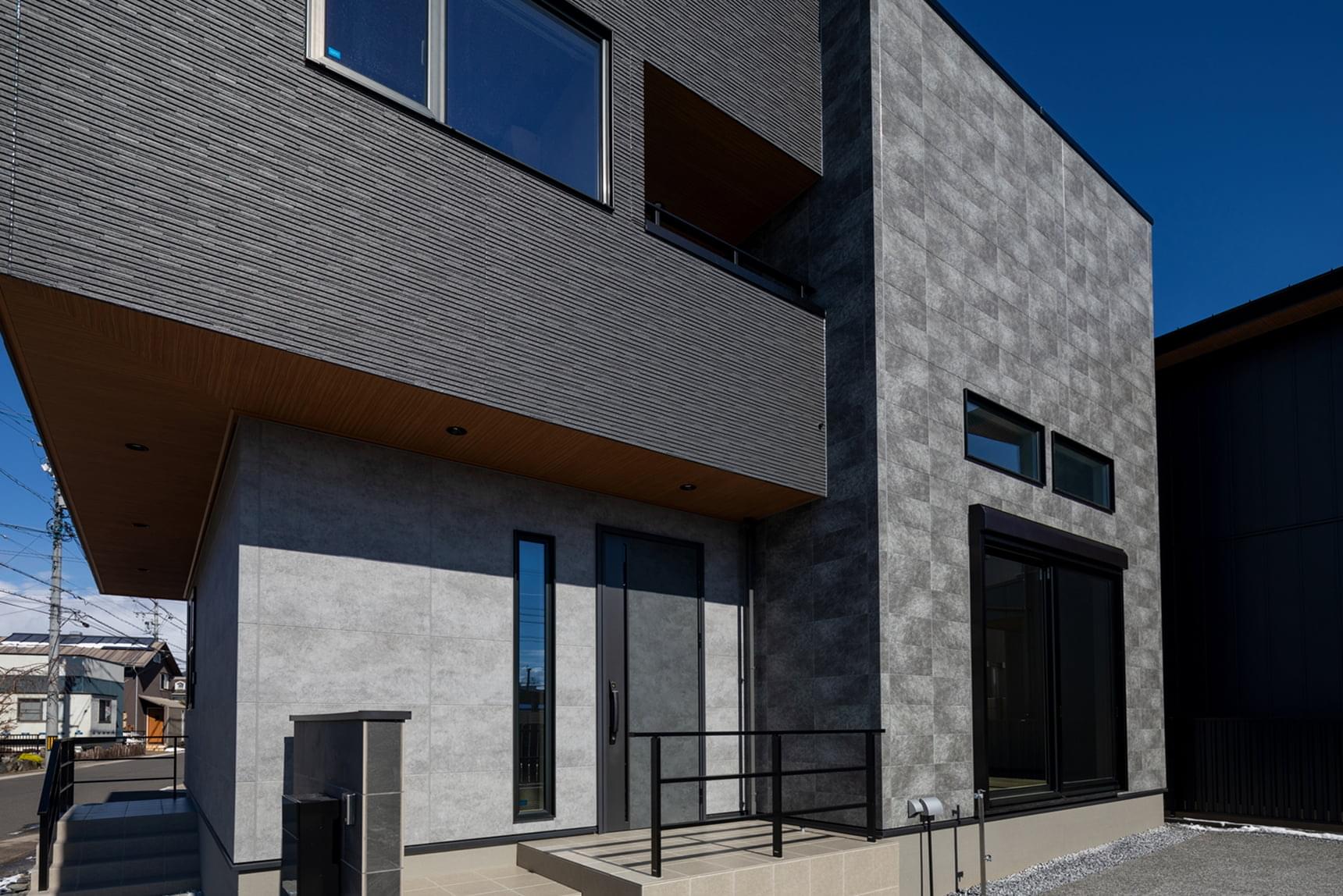 コンクリートの質感をリアルに表現した「フィエルテ」を大胆に配し、フラットなストーンタイルで引き締めました。無骨になりがちなコンクリート調も、ダークトーンでまとめるとシックで洗練された印象に。素材そのものの力強さを活かした、ミニマルでストイックなグレースタイルです。