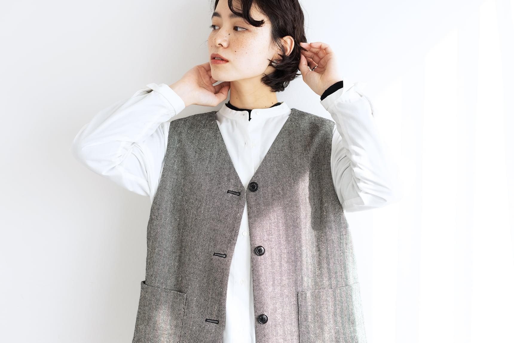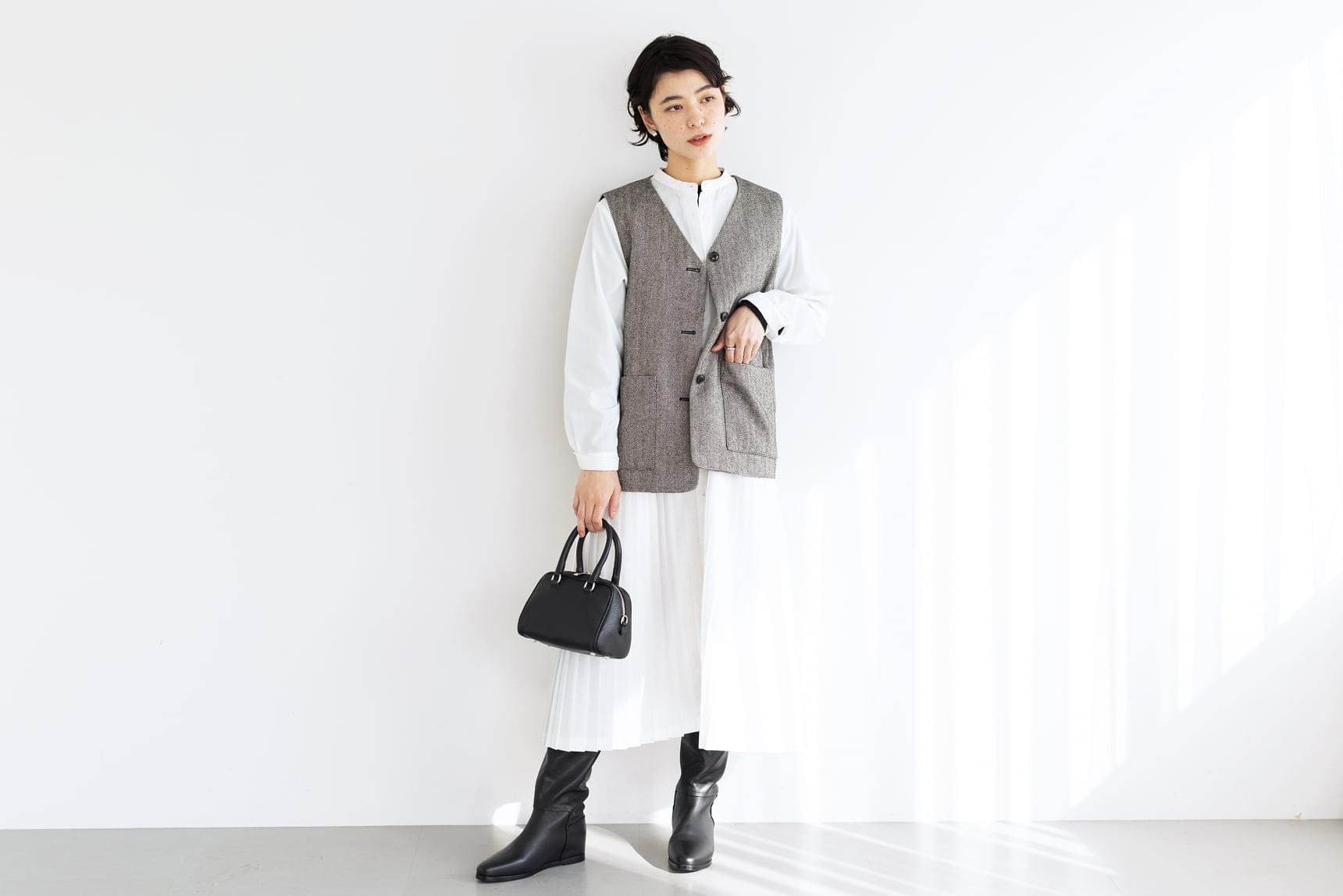 要所にブラックを効かせたツイードベストが主役のスタイル。ヘリンボーン柄がクラシカルな表情をつくりながらも、オーバーなサイズ感で今の空気をさりげなくプラス。ロングブーツを合わせて、ほどよくキリッとしたモダンさを添えます。